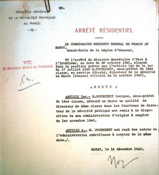Les routines qui ont ligoté la France, la routine administrative était la plus étouffante, le maréchal Pétain l’a tuée. Ce que j’ai trouvé à Vichy, dans les conditions terribles de travail que vous connaissez, ce sont des gens ardents qui ne s’embarrassent pas de formalités et qui savent prendre leurs responsabilités. C’est vraiment une administration revivifiée qui s’est mise au travail. Ce grand effort de rajeunissement et de simplification, je l’ai annoncé pour le Maroc, il y a quelques jours, à l’occasion de l’anniversaire de la mort du maréchal Lyautey, et je l’ai placé sous son égide. Le Gouvernement français m’a donné tout son appui pour le poursuivre. J’entends y consacrer toute ma volonté. Les jours qui viennent seront fertiles en réalisation dans tous les domaines. Ce qui est en jeu, c’est notre bien, notre famille, l’avenir de la France et du Maroc Rien ne m’arrêtera dans cette œuvre de sauvegarde. L’enjeu est bien trop considérable pour que je tolère la moindre défaillance. Il faut que tout le monde se mette avec acharnement au travail et comprenne que le moment est venu de l’union, de l’obéissance et du devoir.